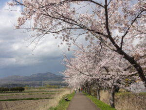 伊達温泉前の桜並木の続くサイクリングロードは、晴れた日には